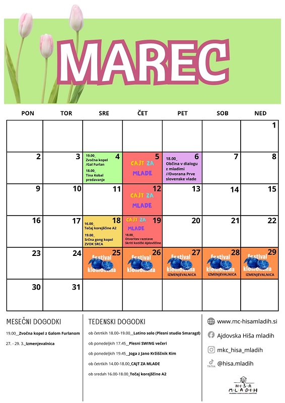 27.02.2026 - 31.03.2026Marec v Hiši mladih prinaša raznolik program dogodkov, ki povezuje ustvarjalnost, druženje, znanje in sprostitev. Poleg predavanj, delavnic, razstav in večernih dogodkov v tem mesecu predstavljamo tudi novo redno mladinsko aktivnost CAJT ZA MLADE, namenjeno osnovnošolcem in srednješolcem, ki si želijo po šoli varnega prostora za učenje, druženje in kakovostno preživljanje prostega časa.
