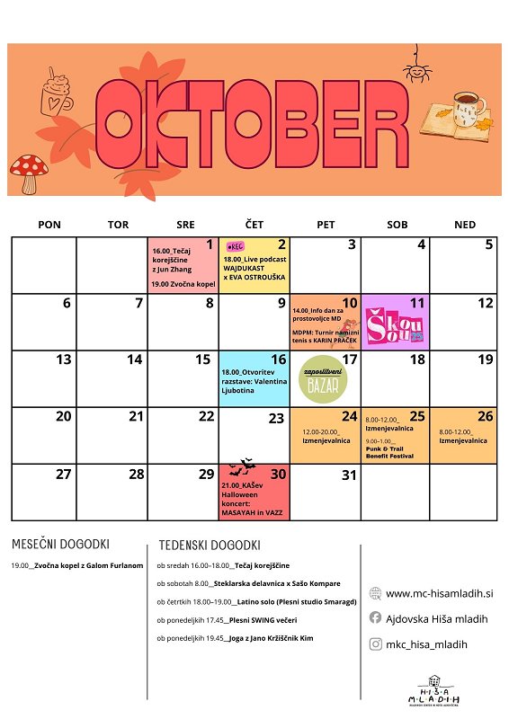01.10.2025 - 31.10.2025Jesen prinaša nove priložnosti in svežo energijo, v Hiši mladih pa vas čaka pester program za vse okuse. Mesec bomo obarvali z novimi znanji, ustvarjalnimi izrazi in druženjem – od učenja korejskega jezika do gibanja ob glasbi in sproščanja z jogo. Ne bodo manjkali niti koncerti, pogovorni večer ter priložnosti za karierno prihodnost na zaposlitvenem bazarju.