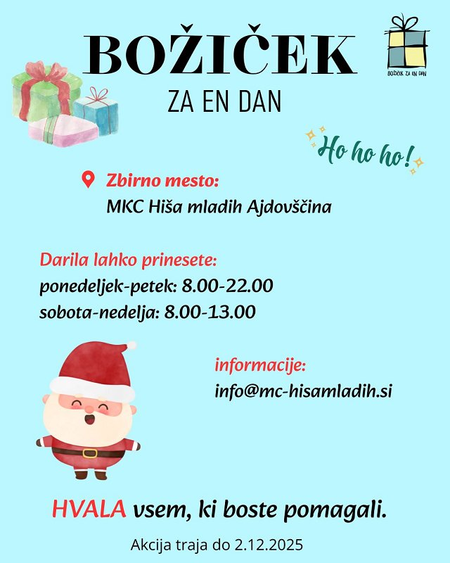 Mladinski kulturni center Hiša mladih Ajdovščina bomo tudi letos sodelovali pri projektu Božiček za en dan, in sicer tako, da bo v naših prostorih zaživelo zbirno mesto za oddajo daril.